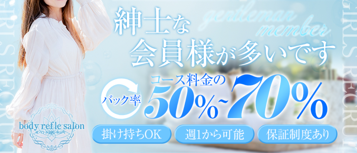 | お店よりメッセージ | 当店は大門・浜松町ルーム、新富町・東銀座ルームがございます。 女性講師が丁寧に研修を行います。施術台での施術となります。 掛け持ちやWワークも可能となってますので空いたお好きなお時間で働けます。 ユニフォーム貸与いたします。わからないことなどありましたらお気軽にご相談ください! |